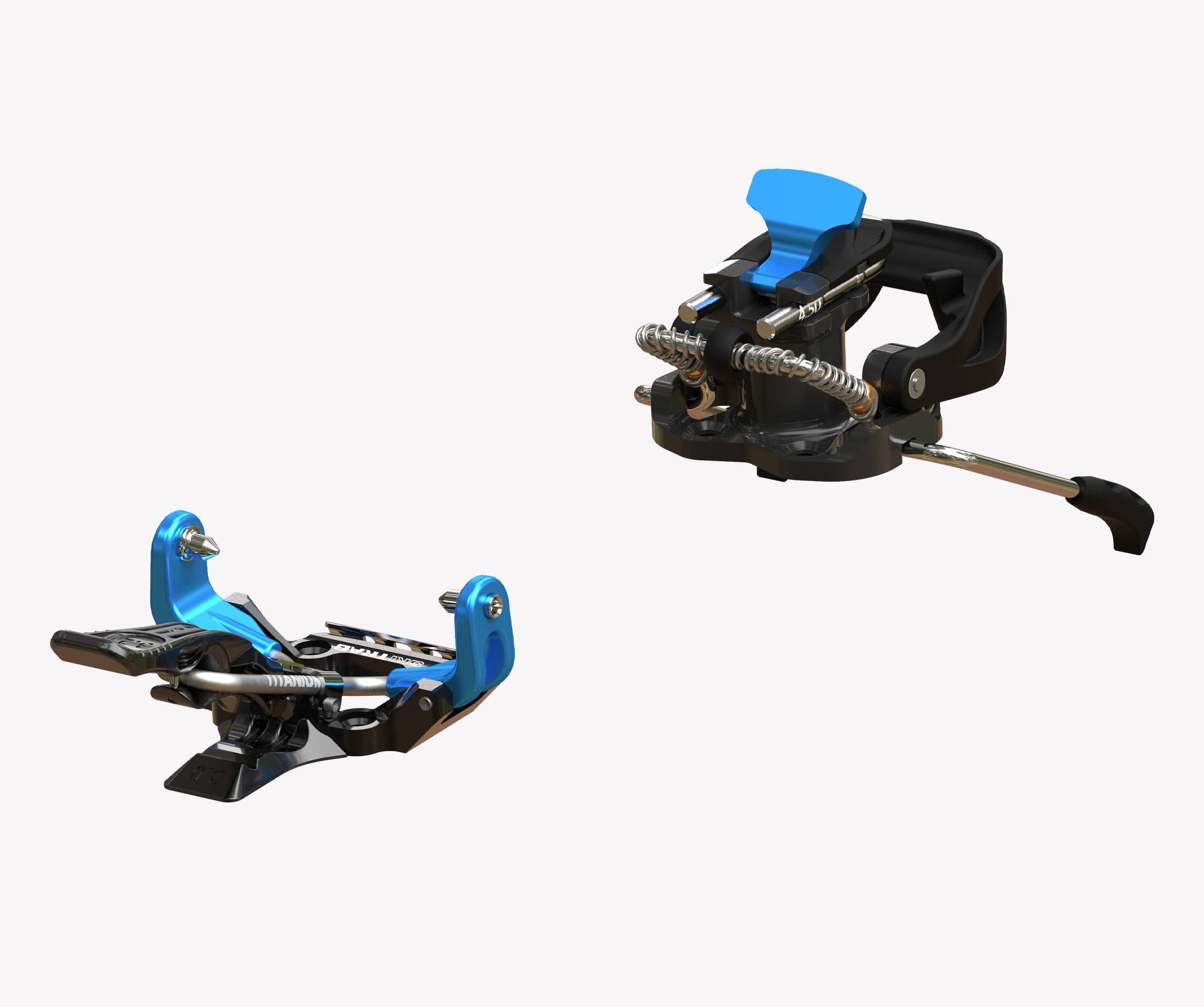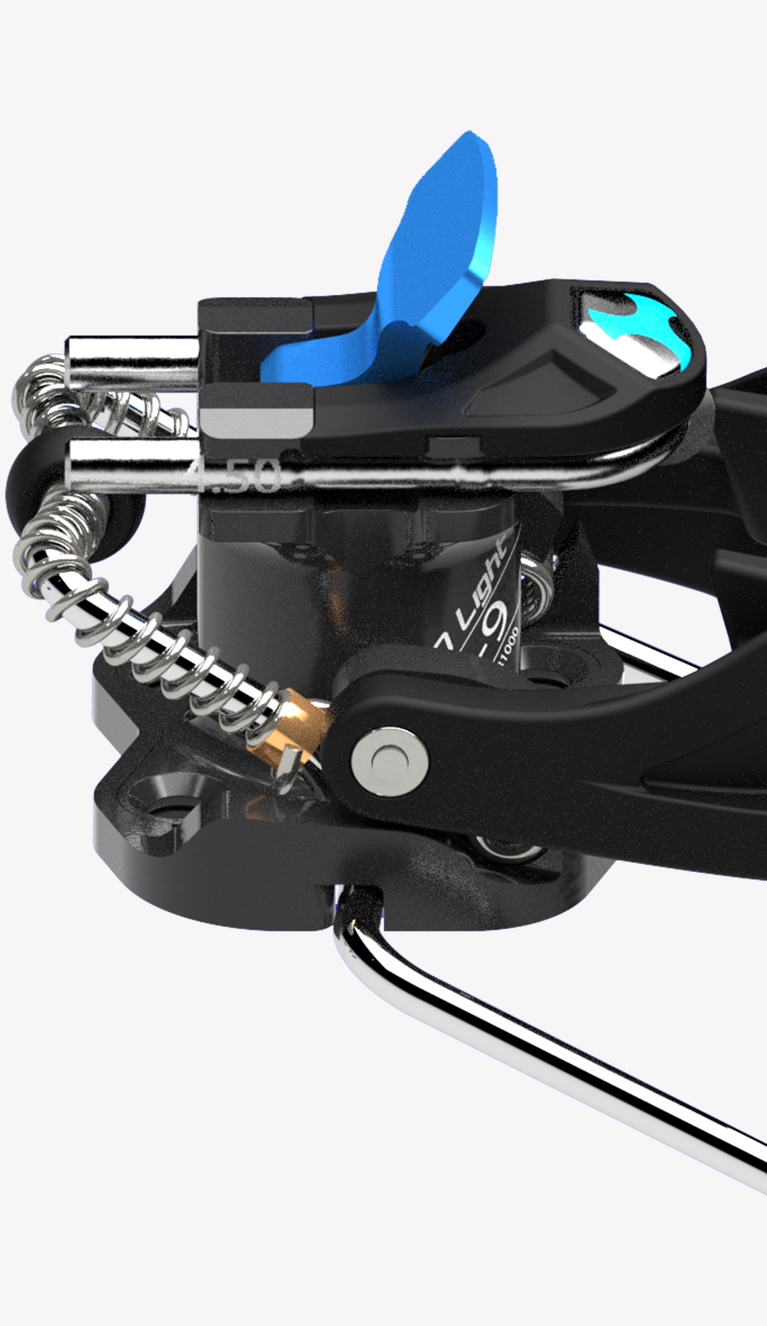 One simple component in titanium specially designed in its shape and structure links the two jaws in the toe unit. This extremely simple mechanism offers a significant guarantee of functionality and reliability. The toe unit jaws open with a light pressure on the front lever, which can be pressed either by hand or with a ski pole. Position the boot so that the jaw pins are level with the holes on the side of the boot, then release the lever so the jaws close locking the toe of the boot into place. Rotate the lever upwards to block the opening of the jaws. This special elastic component in titanium permits the toe unit to adapt perfectly to all types of boots, guarantees that the boot remains fixed in place and with the help of some particularly well finished and crafted pins it can clean out the boot inserts during use.