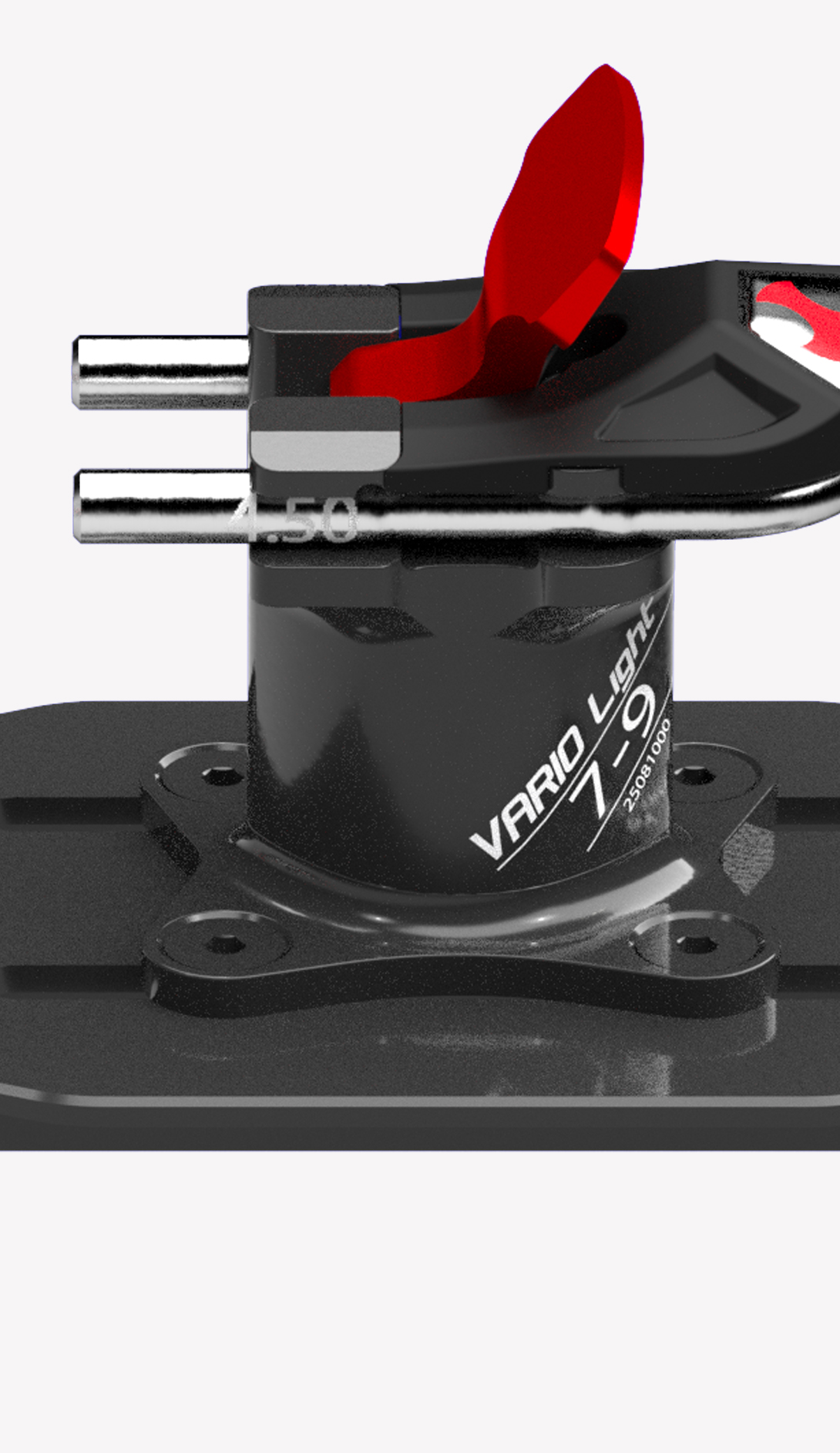 Un solo e semplice elemento in titanio particolarmente studiato nella sua forma e geometria collega le due ganasce del puntale. Questo meccanismo così semplice fornisce una importante garanzia di funzionalità e di affidabilità. L’apertura delle ganasce del puntale avviene con una facile pressione della leva anteriore, è possibile agire su quest’ultima con la mano o con il bastoncino. Nel momento in cui le spine delle ganasce sono allineate con i fori dello scarpone basta rilasciare la leva e le ganasce si chiudono bloccando la punta dello scarpone. Con la mano si ruota la stessa leva verso l’alto per bloccare l’apertura delle ganasce. Il particolare elemento elastico di titanio permette al puntale di adeguarsi perfettamente a tutti i tipi di scarponi, garantisce un ottimo bloccaggio dello scarpone e con l’aiuto di spine particolarmente rifinite e lavorate riesce a ripulire il foro scarpone durante l’uso.